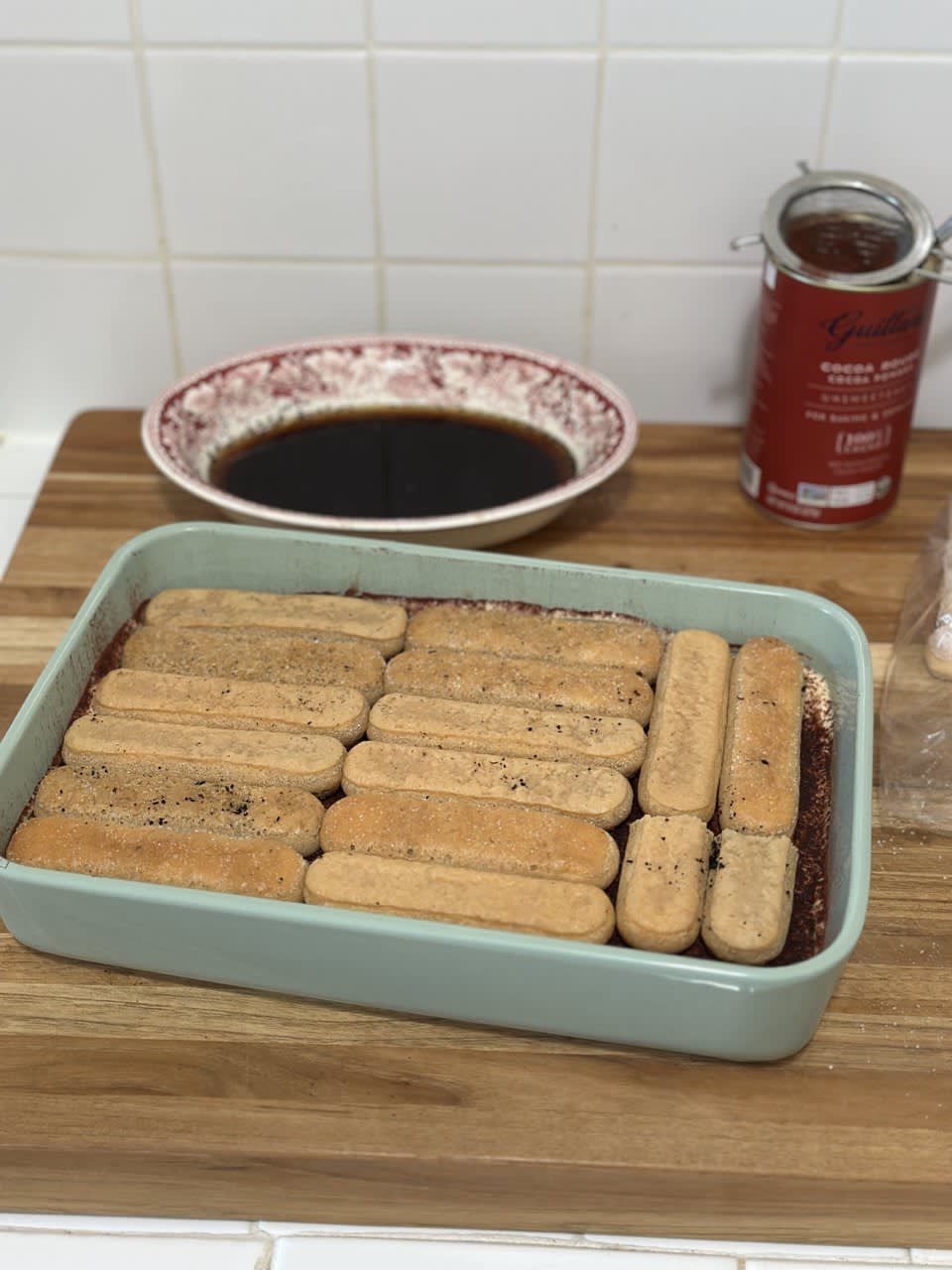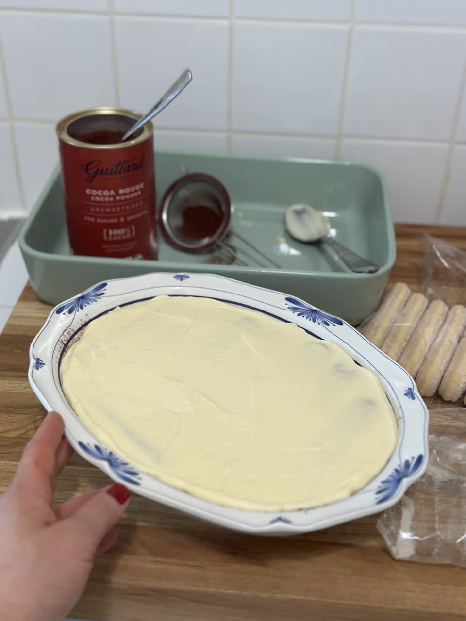 - Înmoaie pișcoturile rapid în cafea și așază-le în tavă. Acoperă cu cremă și presară cu cacao pudră. Repetă cu încă un strat de pișcoturi, apoi acoperă cu restul de cremă și nivelează.
