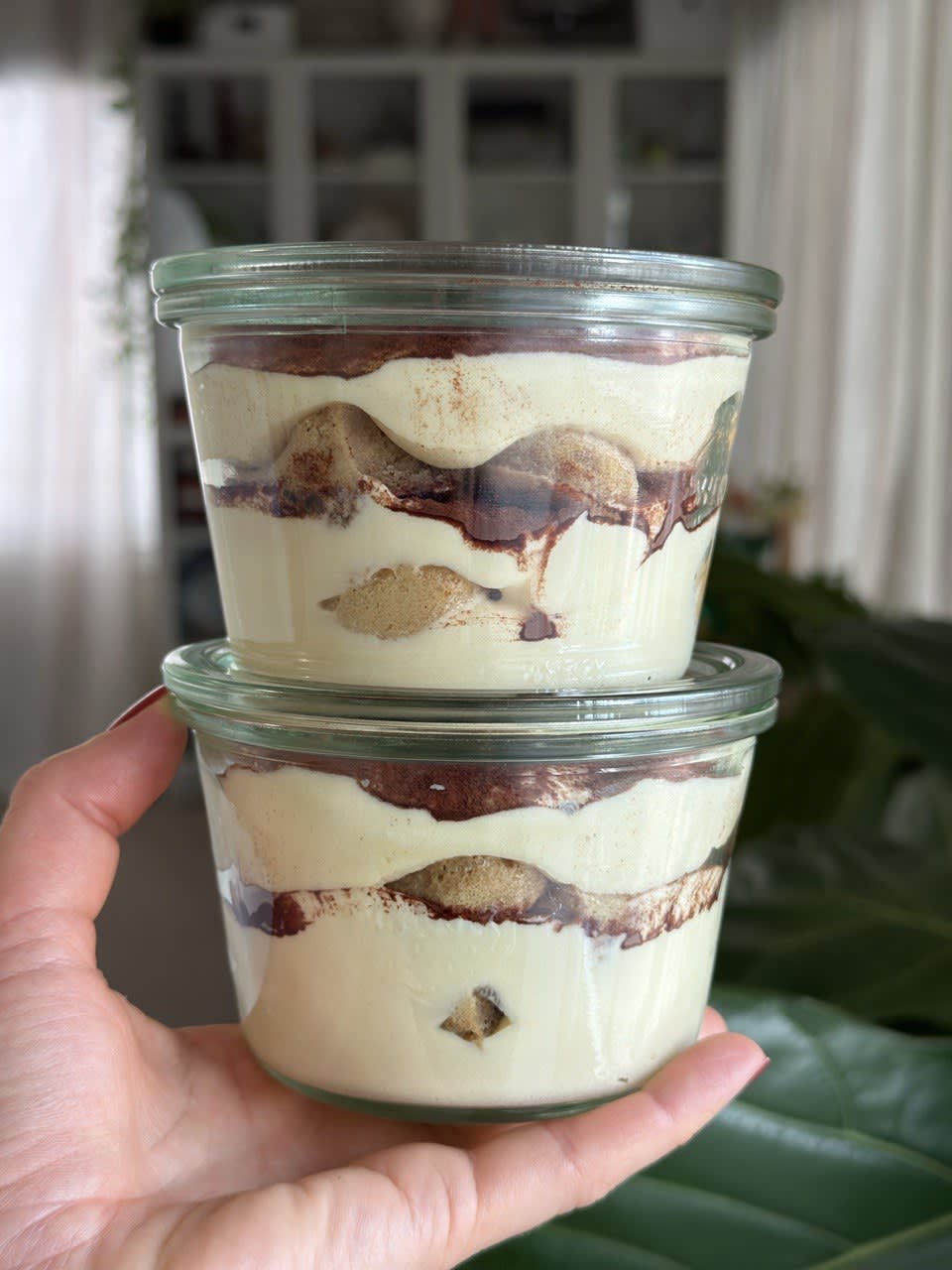 Desertul poate fi asamblat într-un vas larg, adânc, sau în porții individuale. Pentru asta, poți folosi pahare sau borcane cu capac.